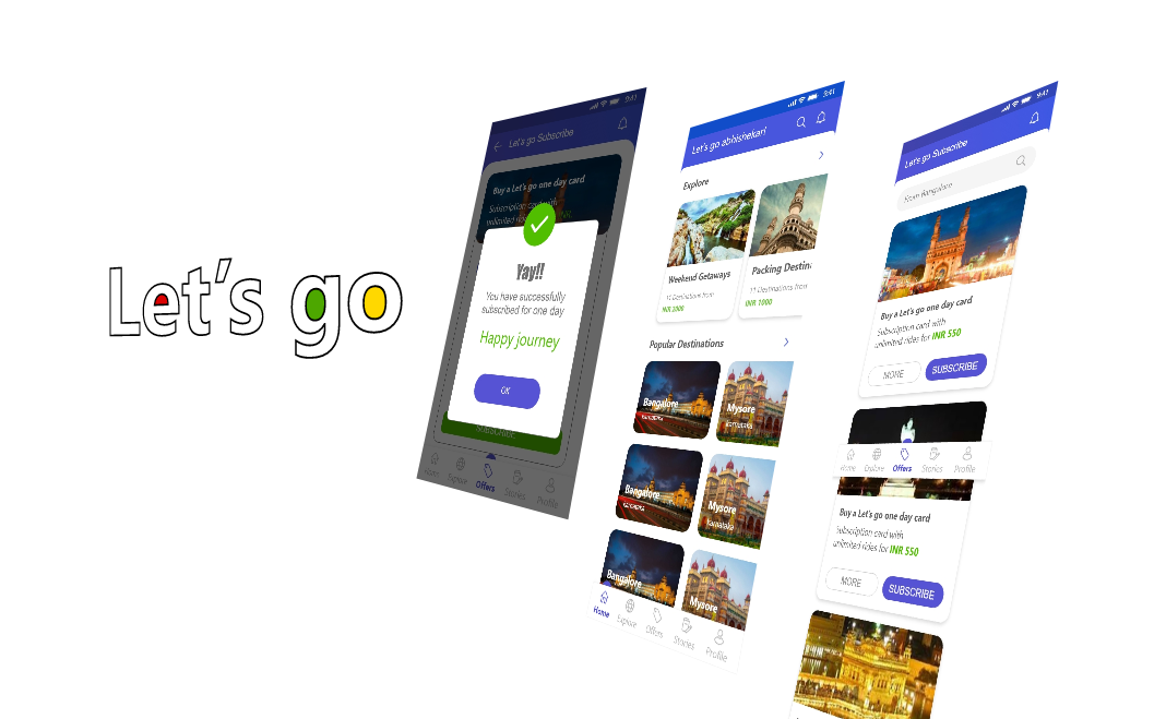 Let's Go app is a transportation app that aims to make daily travel easier for commuters in India. It allows users to book daily, weekly, and monthly passes for BMTC buses online, as well as tickets for DTC buses online. It also provides live tracking of DTC buses and other transportation options such as cabs, ola, and more. The app is designed to be a one-stop solution to all the hassles of regular transportation options and the struggle to find reasonably priced short distance rides. The app also supports the environmental and social sustainability of the cities and the communities. The app's design followed a user-centered design process, and resulted in a user-friendly, intuitive, and attractive interface, that provided users with a seamless and satisfying travel experience. The app's design also followed the principles of simplicity, clarity, and accessibility, to ensure the app's usability and appeal. The app's design was validated and refined through user testing and feedback, and was ready to be launched in the market.